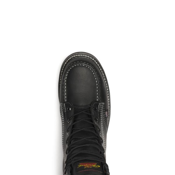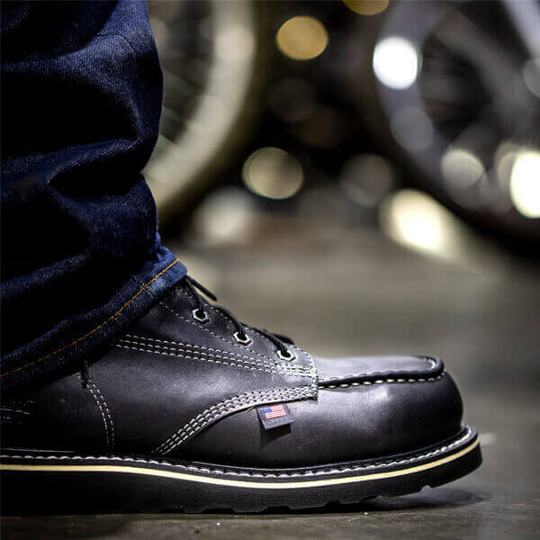 There ought to be a man in black, and the Midnight Series 8″ black safety toe moc toe work boots makes that happen. These boots are as tough as they look, crafted for risk takers who aren’t afraid to get their hands dirty. The Midnight Series 8″ Boots are popular for iron workers, motorcycle riders, and other hard working Americans who are on their feet from dawn to dusk. Stand out with bold style and comfort you won’t find anywhere else. These boots are from our popular American Heritage series. We included these boots in our popular American Heritage series because they contain a century’s worth of skill, style, and know-how passed down from generation to generation of hard-working American craftspeople. These black steel toe work boots give you added protection with the 8-inch shaft height, while the MAXWear Wedgeª outsole is slip and oil resistant. The durable Goodyear storm welt construction will give you years of worry-free wear.